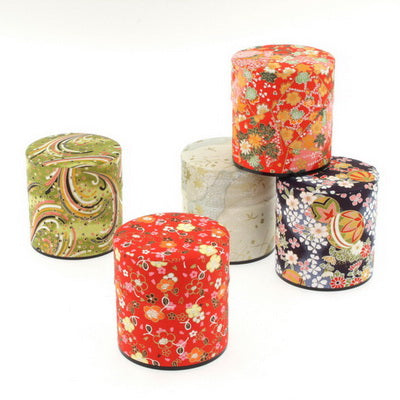 These tea tins are covered with chiyogami, a type of washi paper that uses hand stenciled or printed traditional Japanese imagery featuring bright colors and patterns. The tins contain an inner lid to ensure airtight storage. Colors and patterns may vary.